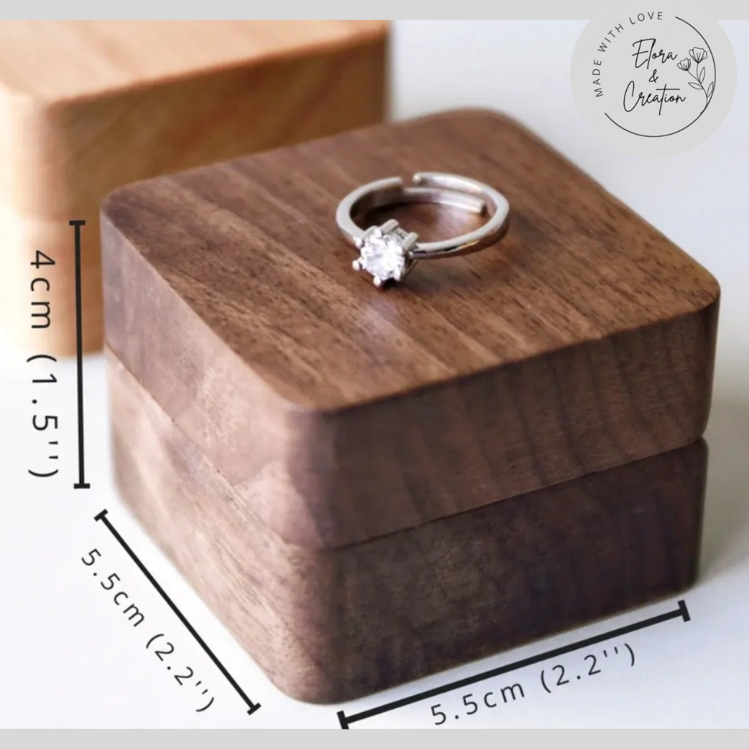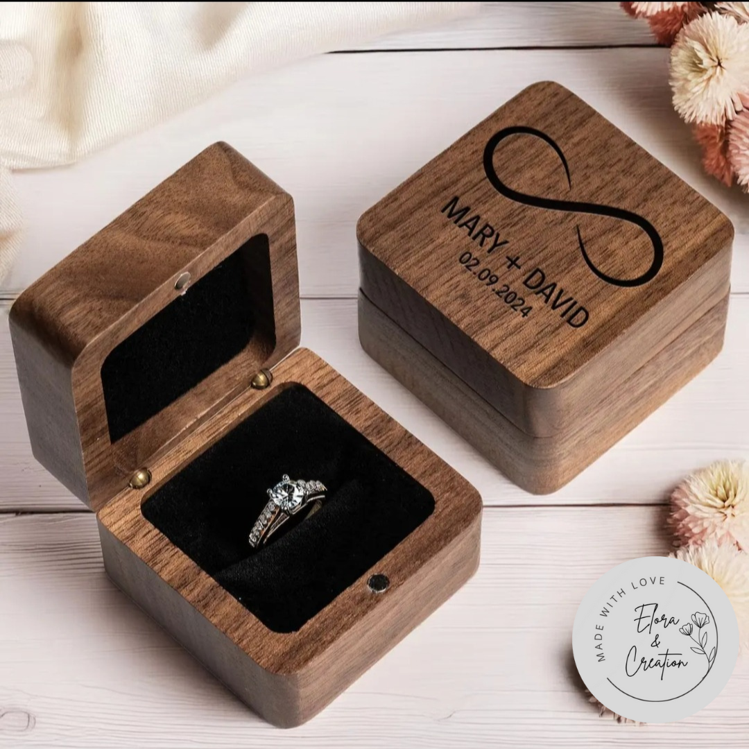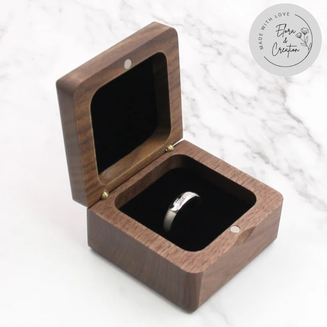 This elegant wooden ring box is custom laser engraved with initials, names, monograms, or a heartfelt message, creating a one-of-a-kind keepsake made just for you. Crafted from natural wood, no two boxes are exactly alike—just like your love story.